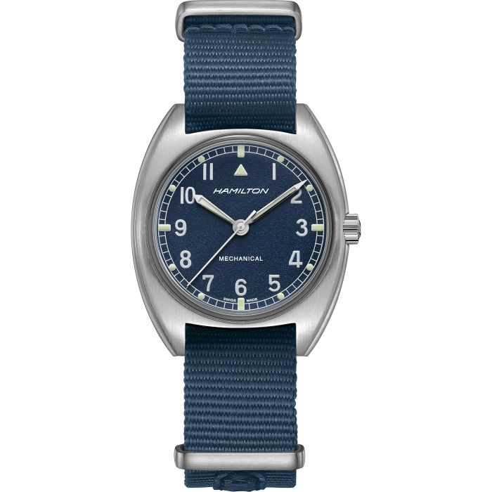 Nuestro impresionante Aviation Blue lleva esta reedición de la Real Fuerza Aérea Británica de los años 70 más lejos que nunca. Ponte el Khaki Pilot Pioneer Mechanical y celebra la historia de Hamilton cronometrando los cielos.