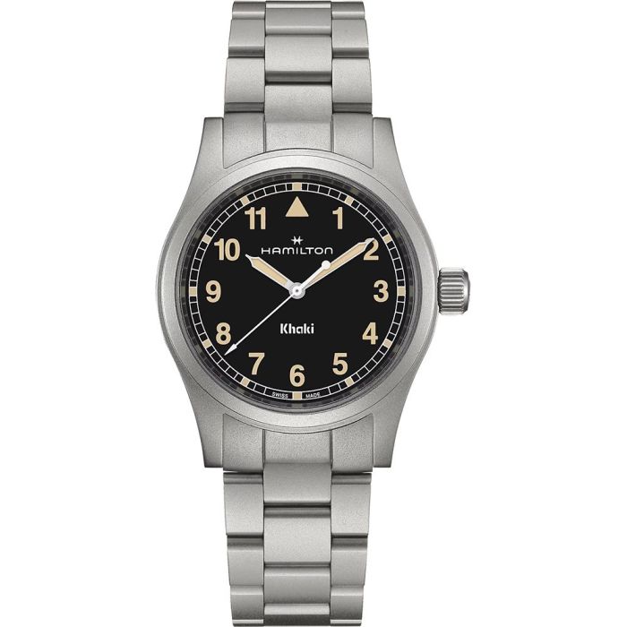 Listo para la aventura, el Khaki Field Quartz es un compañero fiable y resistente, preparado para explorar nuevos horizontes. Inspirándose en nuestra reputación en cuanto a precisión, innovación y diseño funcional, el Khaki Field Quartz combina una esfera negra atemporal de 38 mm con un moderno brazalete de metal. Descubre nuestra colección Khaki Field.