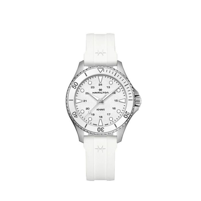 Aproveche el día con este llamativo Khaki Navy Scuba Quartz completamente blanco. El bisel de cerámica de 37 mm con números grabados de forma precisa aporta un estilo de alta mar a este reloj acuático, al tiempo que lo protege de los elementos corrosivos, como la arena y el agua de mar. Su diseño lujoso y deportivo, combinado con una correa de caucho blanca o un refinado brazalete de acero inoxidable a juego, le permitirá ser puntual en sus vacaciones marinas y en sus exploraciones en aguas profundas.