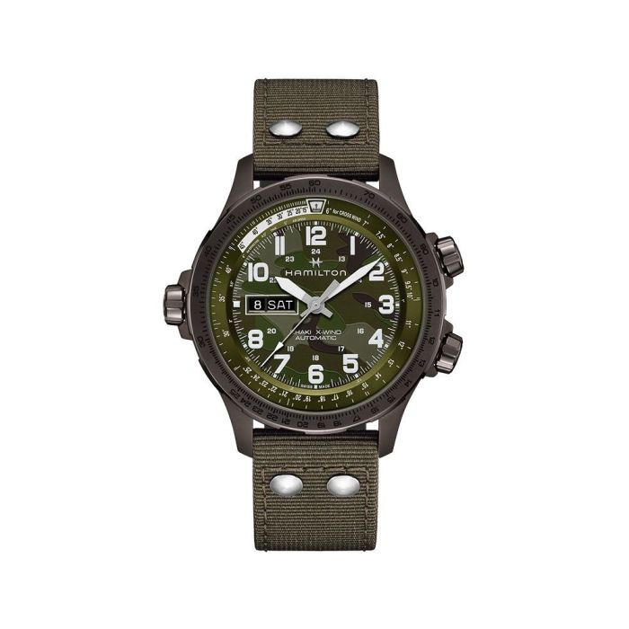 El Khaki Aviation X-Wind Automatic Chronograph, diseñado para los pilotos y creado para la aventura, surca los vientos cruzados con un nuevo aspecto atrevido, con motivos de camuflaje y nuevas variaciones de colores que cubren la esfera, la correa y la caja. Esta pieza de alto rendimiento, que cuenta con un bisel giratorio interno y una espiral de silicio antimagnética, presenta un aspecto combativo y chic, y un estilo resuelto.