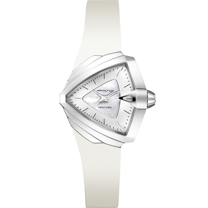 El Ventura original, que fue lanzado en 1957, hizo historia como el primer reloj eléctrico del mundo, animado por una batería. Su diseño atrevido y original lo convirtió rápidamente en un icono y una pieza de colección. La encarnación más reciente del Ventura es un fiel tributo al original y adapta la pionera forma de escudo del diseño moderno de mediados del siglo XX. Esta versión de nácar, pequeña y de líneas depuradas, fue diseñada para las mujeres que buscan un estilo original.