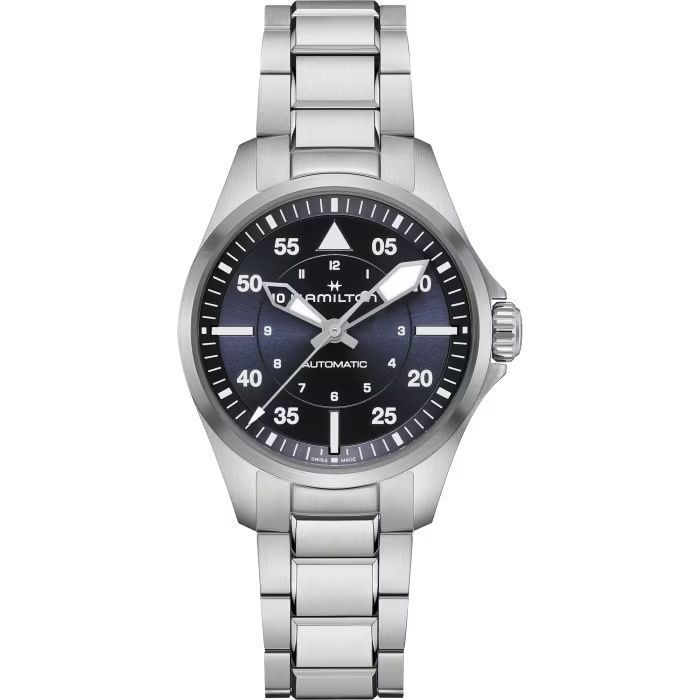 El Khaki Pilot Auto, diseñado para los verdaderos amantes de la aviación, evoca el espíritu de la exploración y la aventura del Khaki. Las versiones de 36 mm, impulsadas por el movimiento automático H-10 con una reserva de marcha de 80 horas y un resorte regulador de Nivachron™, responden a la tendencia de relojes más pequeños. Estos diseños más compactos, que cumplen los estándares de precisión de la cabina, cobran vida en el cielo y en tierra firme. El Khaki Pilot Auto combina un brazalete atemporal de acero inoxidable con una esfera azul noche intenso y un revestimiento especial de Super-LumiNova para una mayor legibilidad.