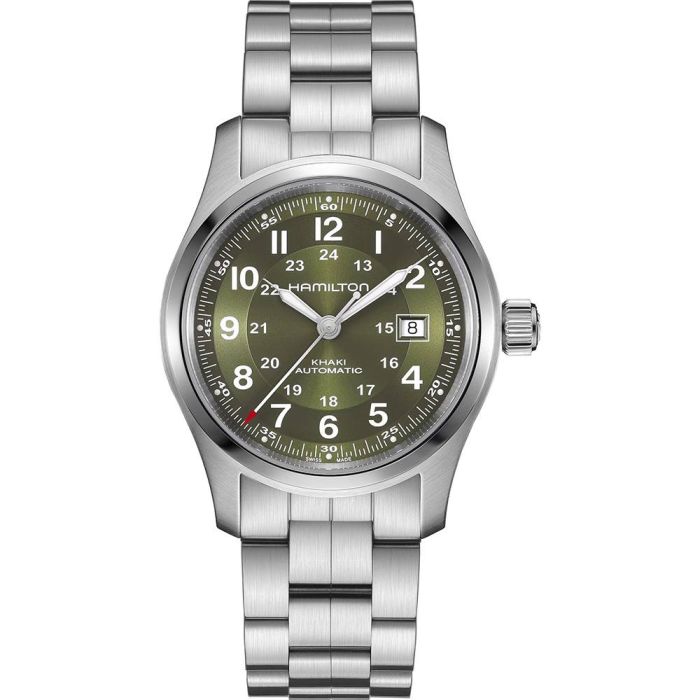 Inspirado en el reloj de soldado original, el Khaki Field Automatic combina el legado militar con el diseño contemporáneo, ofreciendo versatilidad para los pioneros modernos. Su esfera verde caqui con acabado de rayos de sol y un efecto en espiral en el anillo de las horas, refleja la luz a la vez que ofrece textura y profundidad. Diseñado para la acción y preparado para la aventura, su exclusivo calibre automático H-10 ofrece hasta 80 horas de reserva de marcha, asegurando un rendimiento fiable en cualquier situación. Descubre nuestra colección Khaki Field.