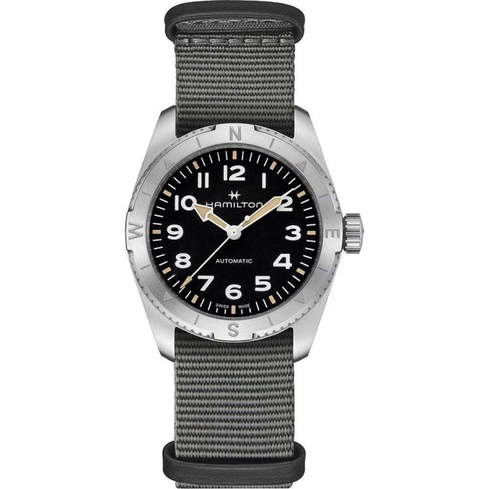 Prepararse para grandes aventuras al aire libre nunca ha sido tan fácil. Gracias al Khaki Field Expedition y su nueva correa NATO, este reloj todoterreno con diseño de brújula te permitirá continuar la excursión con la ayuda del sol. Este modelo con caja de acero inoxidable de 37 mm y correa NATO de tejido gris está equipado con una corona atornillada y una esfera negra con acabado arenado, que lo convertirán en tu reloj más resistente