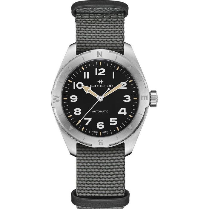 Prepararse para grandes aventuras al aire libre nunca ha sido tan fácil. Gracias al Khaki Field Expedition y su nueva correa NATO, este reloj todoterreno con diseño de brújula te permitirá continuar la excursión con la ayuda del sol. Este modelo con caja de acero inoxidable de 41 mm y correa NATO de tejido gris está equipado con una corona atornillada y una esfera negra con acabado arenado, que lo convertirán en tu reloj más resistente.