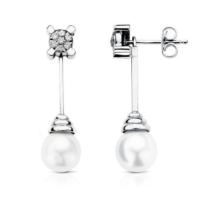 Pendientes largos de oro blanco con diamantes talla brillante y perlas cultivadas australianas. Cierre de presión.