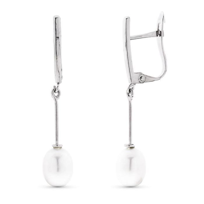Pendientes largos de oro blanco con perla cultivada y cierre catalán.